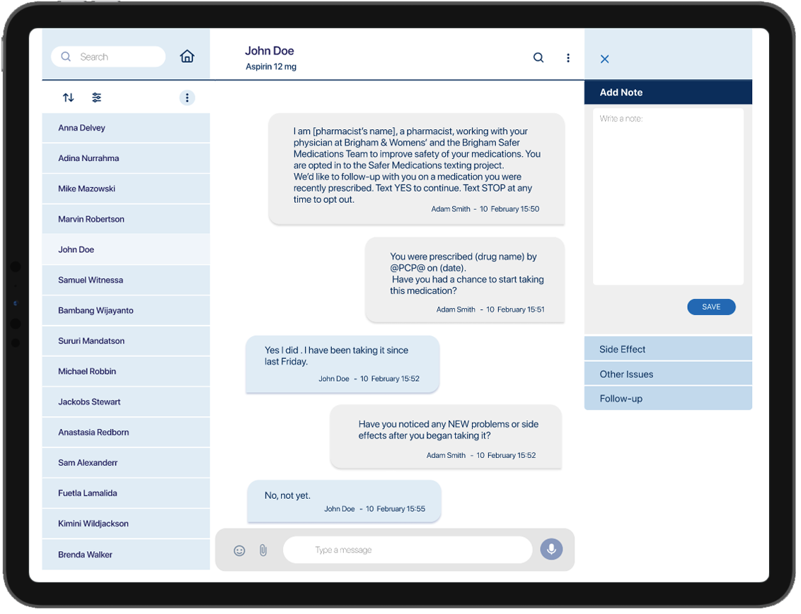 Project entitled “Designing and Deploying Automated Adverse Drug Reaction Surveillance System”. The main goal of the project is to design and deploy an automated comprehensive surveillance system to monitor potential adverse reactions in patients newly started on medications. Over 4,000 patients were reached by text message to inquire about any symptoms from new medicines they were recently prescribed.