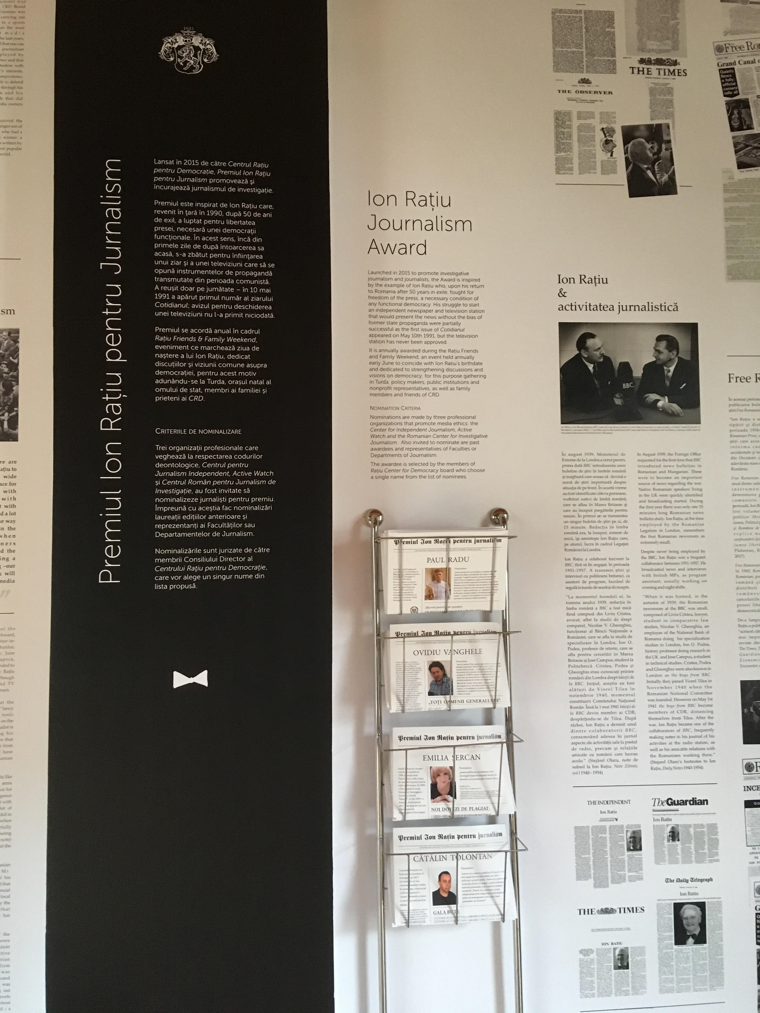 The entire wall was covered in newspapers, showcasing pieces of scanned articles by and about Ion Ratiu, and documents from the family archive.